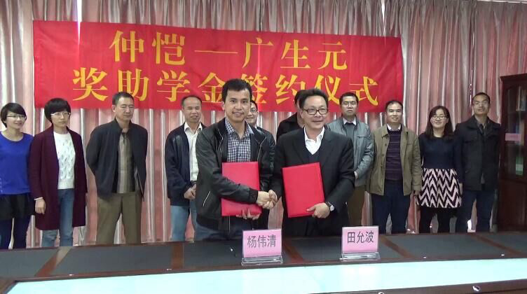 在双方代表的见证下,田允波副校长、杨伟清总经理分别代表开元官网和广生元公司签署了《校企合作协议书》,并举行了隆重简朴的“奖助学金基地”揭牌仪式。