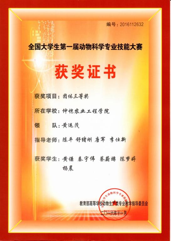 11月26日,在刚刚落幕的第一届全国大学生动物科学专业技能大赛中,KY开元集团官网学子喜获三等奖。