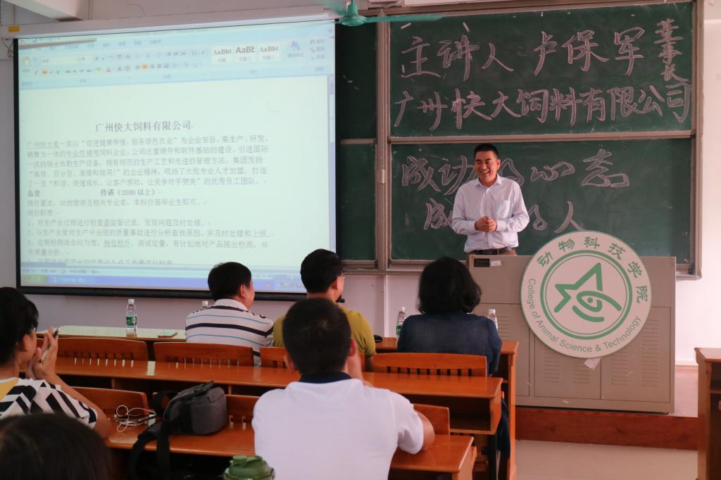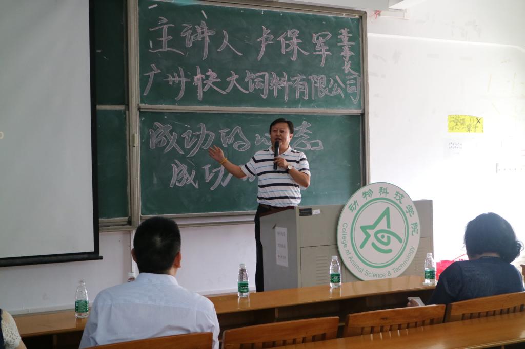 11月17日下午,KY开元集团官网“职面未来”系列讲座第八场在白云校区杨钊杨勋楼506室顺利举行。广州快大饲料有限公司董事长卢保军为大家作了“成功的心态,成功的人”主题讲座。广东省饲料行业协会副秘书长周洪、KY开元集团官网党总支书记曾献尼等出席本次讲座。