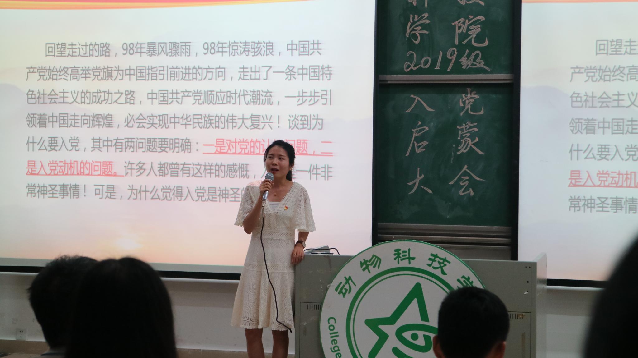 会上,许鸿主要围绕“党的基本知识”、“为什么要加入中国共产党”、“如何入党”以及“入党基本要求和条件”四个部分做了详细的解读。她还同新生分享了自己的入党经历,激励新生积极加入中国共产党,并指出我们要带着一颗“信仰”的心面向党组织,人一旦有了信仰,那么无论前方有多少困难险阻,我们才有足够自信的力量去抵御艰险,面对挫折奋发而上。