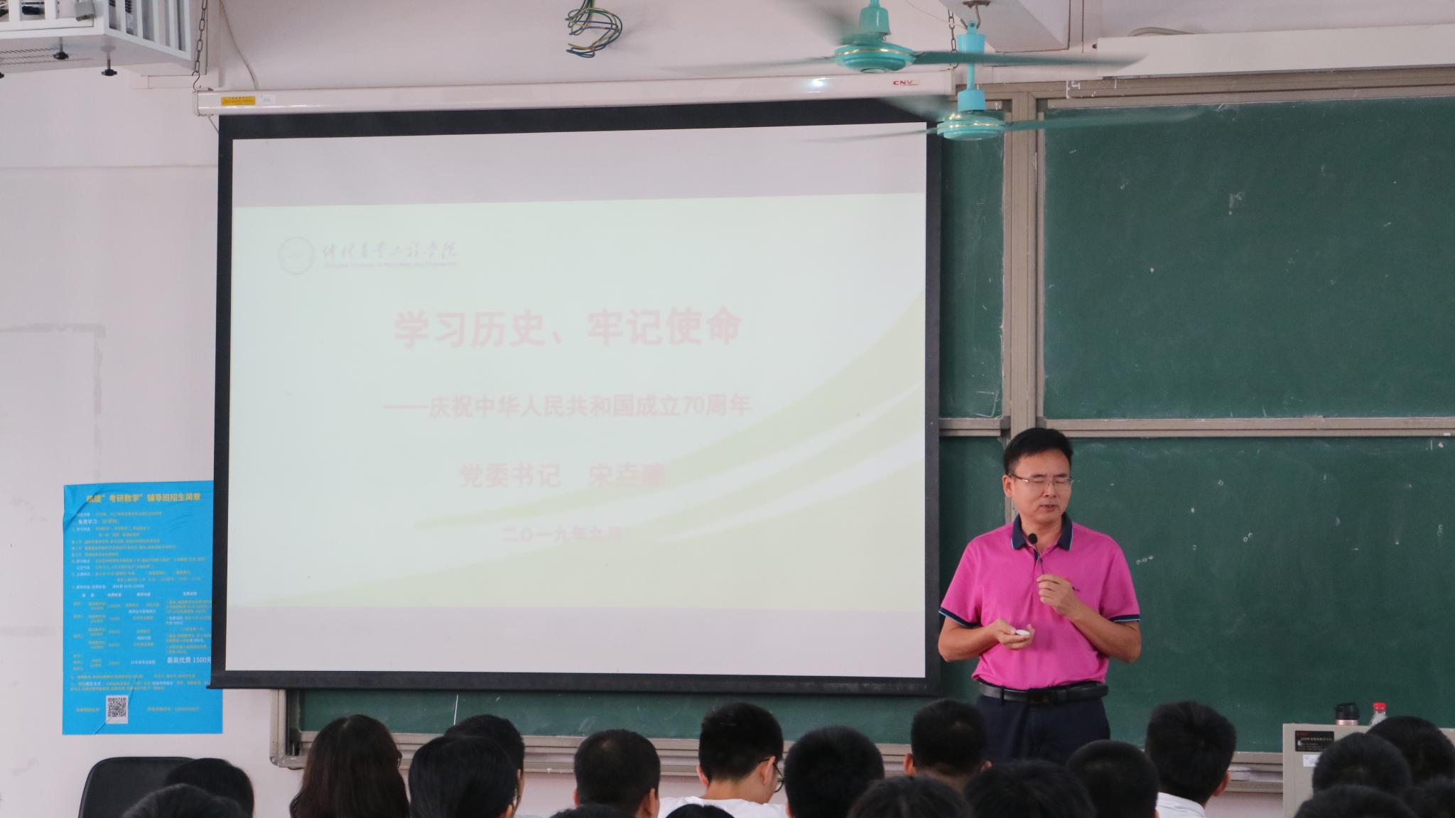 9月25日上午,学校党委书记宋垚臻以“学习历史,牢记使命”为主题,在白云校区杨钊杨勋楼402 为KY开元集团官网动科水产专业2018级学生讲授本学期第一堂思政课。