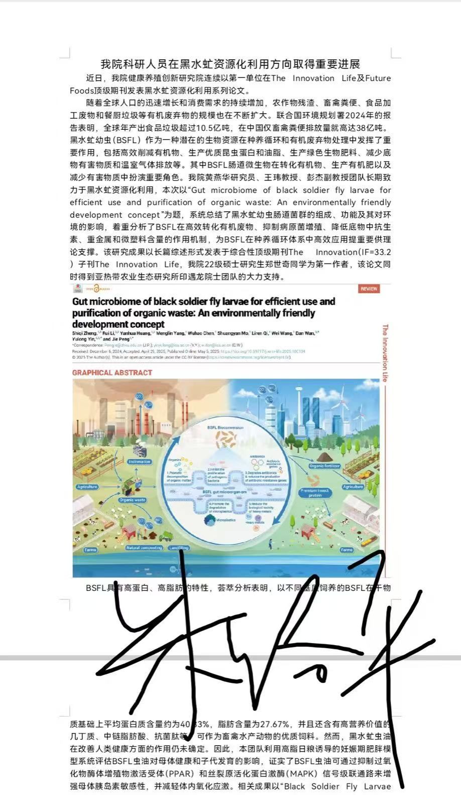随着全球人口的迅速增长和消费需求的持续增加,农作物残渣、畜禽粪便、食品加工废物和餐厨垃圾等有机废弃物的规模也在不断扩大。联合国环境规划署2024年的报告表明,全球年产出食品垃圾超过10.5亿吨,在中国仅畜禽粪便排放量就高达38亿吨。黑水虻幼虫(BSFL)作为一种潜在的生物资源在种养循环和有机废弃物处理中发挥了重要作用,包括高效削减有机物、生产优质昆虫蛋白和油脂、生产绿色生物肥料、减少底物有害物质和温室气体排放等。其中BSFL肠道微生物在转化有机物、生产有机肥以及减少有害物质中扮演重要角色。开元官网黄燕华研究员、王玮教授、彭杰副教授团队长期致力于黑水虻资源化利用,本次以“Gut microbiome of black soldier fly larvae for efficient use and purification of organic waste: An environmentally friendly development concept”为题,系统总结了黑水虻幼虫肠道菌群的组成、功能及其对环境的影响,着重分析了BSFL在高效转化有机废物、抑制病原菌增殖、降低底物中抗生素、重金属和微塑料含量的作用机制,为BSFL在种养循环体系中高效应用提重要供理论支撑。该研究成果以长篇综述形式发表于综合性顶级期刊The Innovation(IF=33.2)子刊The Innovation Life,开元官网22级硕士研究生郑世奇同学为第一作者,该论文同时得到亚热带农业生态研究所印遇龙院士团队的大力支持。