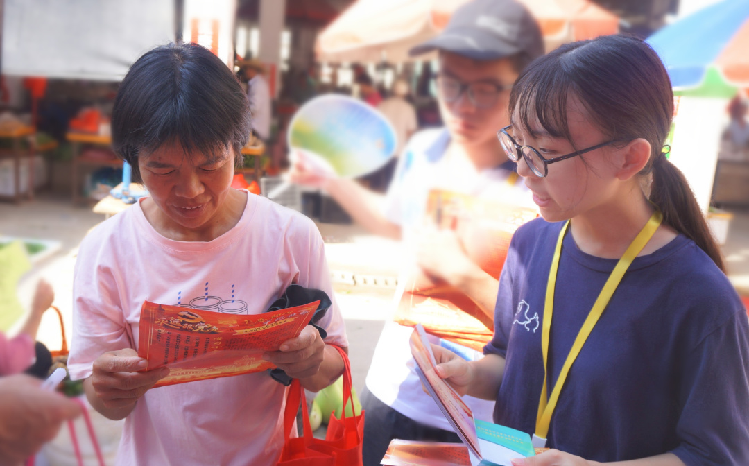 调研组分成了三个小分队,一队协助宣传组在马头镇综合市场进行国家政策宣传摆摊,一队前往张田坑村协助义教组进行今日的义教活动,另一队对新丰县驻湖塘村温干部进行了访谈。