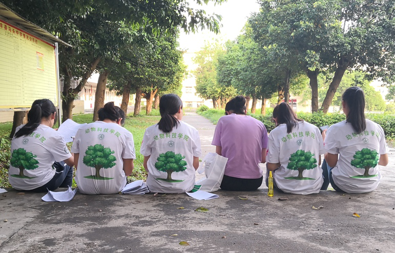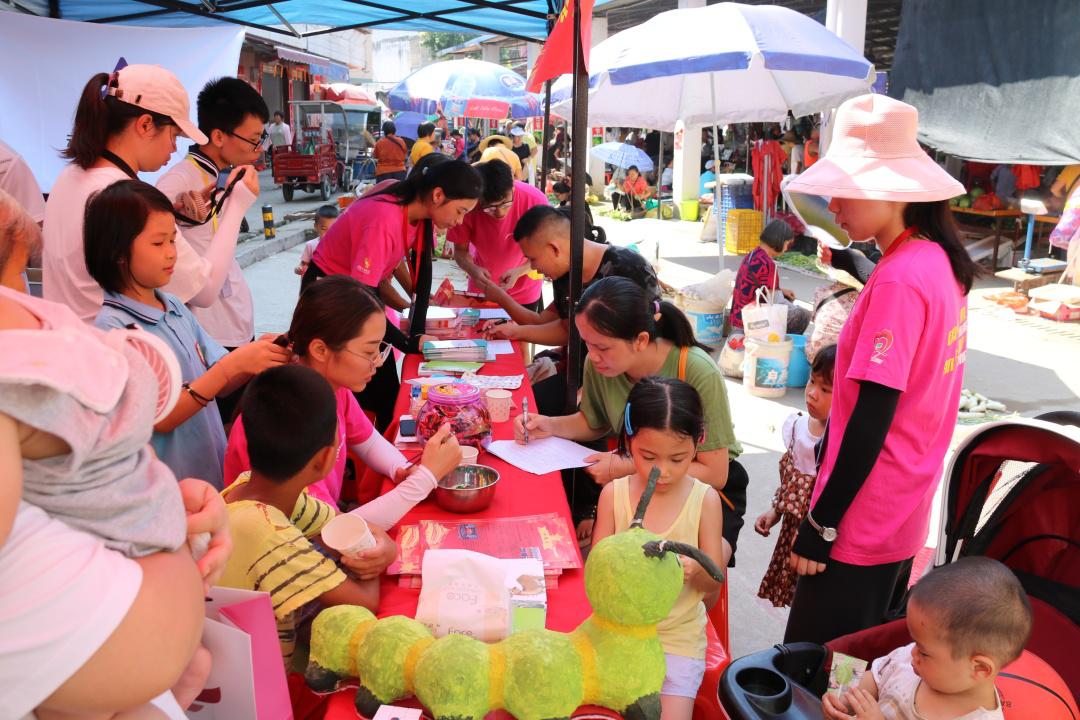 摊位上供孩子游玩的小游戏吸引来许多过往的孩子,且许多村民驻足观望,组员们积极且热情地为过往的村民宣传关于十九大精神、保护生物多样性的相关内容,并向他们讲解了关于“广东省国家助学贷款”的相关政策,并引导其完成调查问卷。