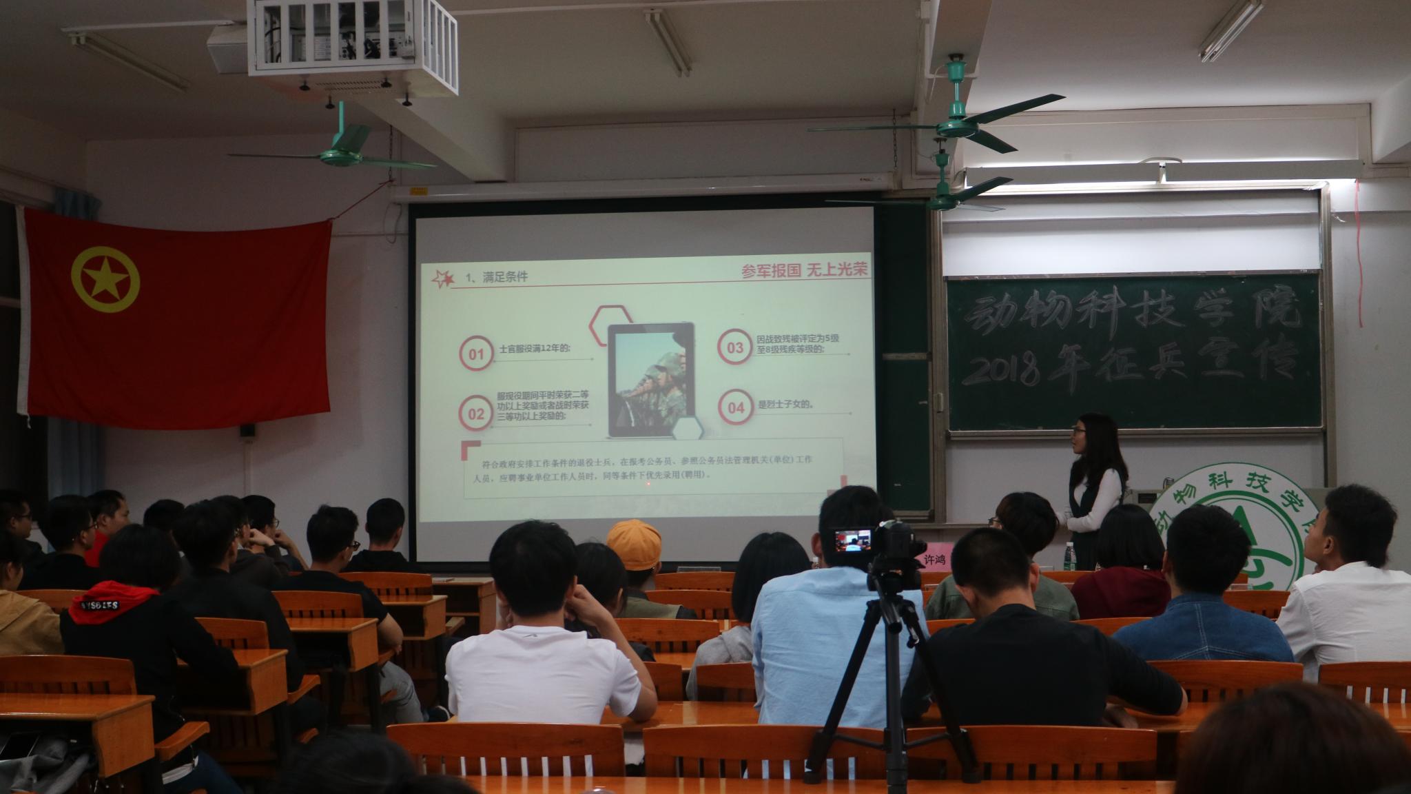 2018年3月22日晚上KY开元集团官网在白云校区杨钊杨勋楼308室举行征兵宣传活动。会议由KY开元集团官网辅导员许鸿老师主持,KY开元集团官网2017届的三名学生教官、退伍义务兵岑靖运和动科院学生参加了本次活动。