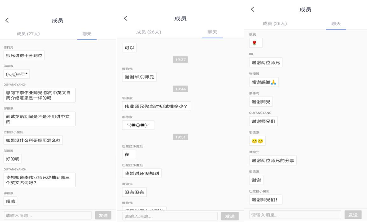 在经验分享环节,易华东、李伟业分别介绍了自身考研复试的经历,分享了复试的宝贵经验和成功秘籍,为学弟学妹们加油鼓劲。即将参加复试的同学也纷纷就复试的各个环节存在的疑惑进行提问,易华东和李伟业均一一做了详细的解答。整个考研复试经验分享会在紧张而不失欢快的氛围中进行。
