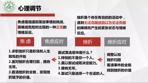 在通过“如何制作一份优秀的简历”小屋后,许鸿老师带领我们敲了敲百变面试的门。在门前,我们了解了自我介绍的隐藏要求以及不同类型面试需注意的问题。如自我介绍时对时间的控制以及如何精准有力的介绍自己,在无领导面试时不仅要积极发言还需有团队意识等等。此外,许鸿老师还教我们如何在面试前、中、后对自我进行心理调节,告诉了我们就算失败也不应气馁,而应调整认知、挫折归因、总结经验。