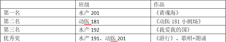本次团日活动复赛共有五个班级晋级,分别是动医181、水产191、水产201、水产192和动医201。