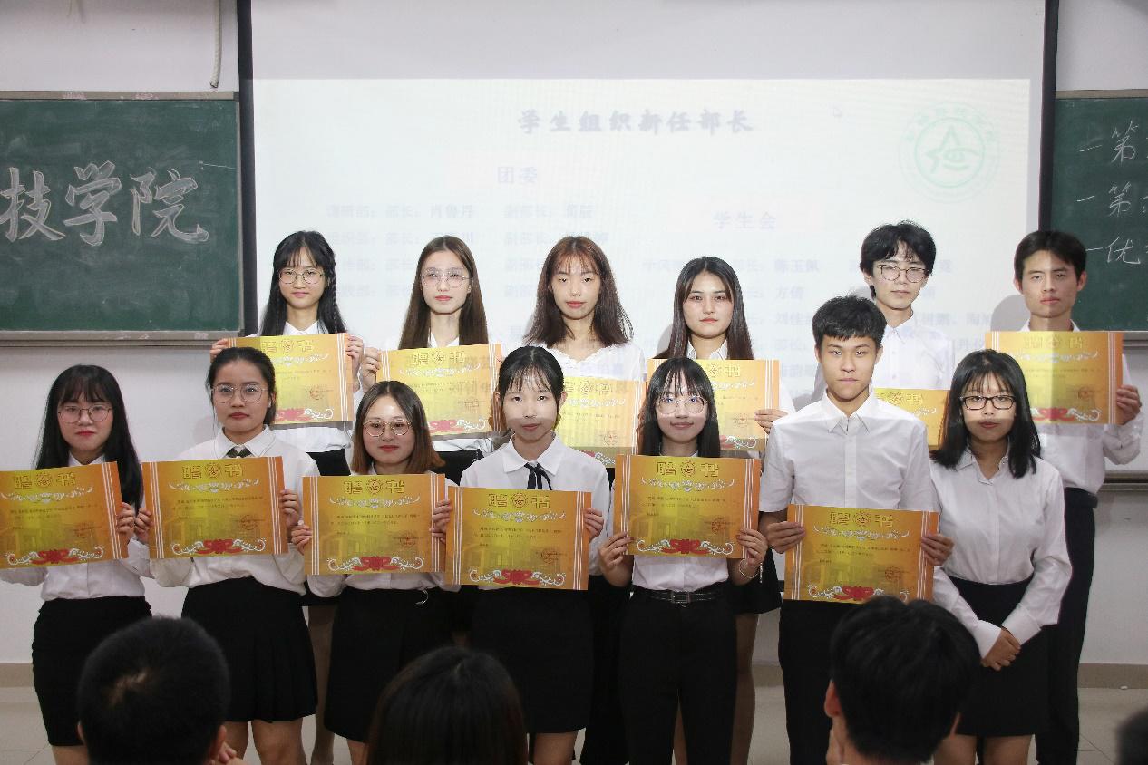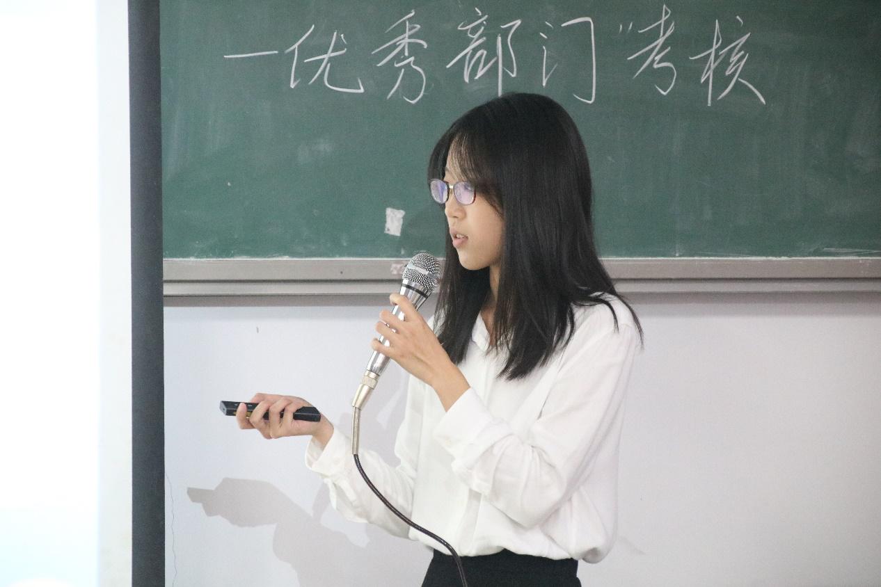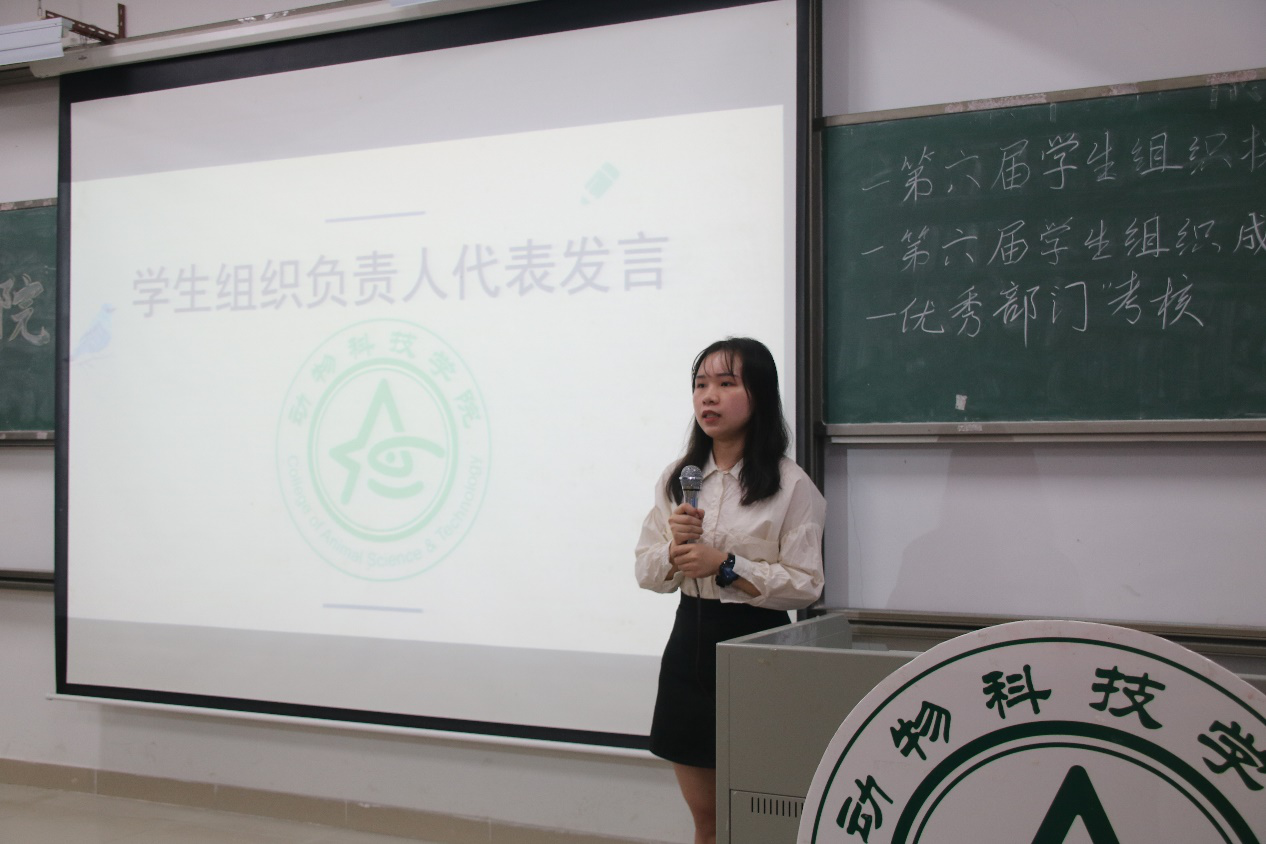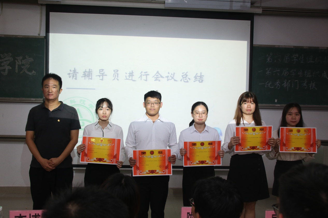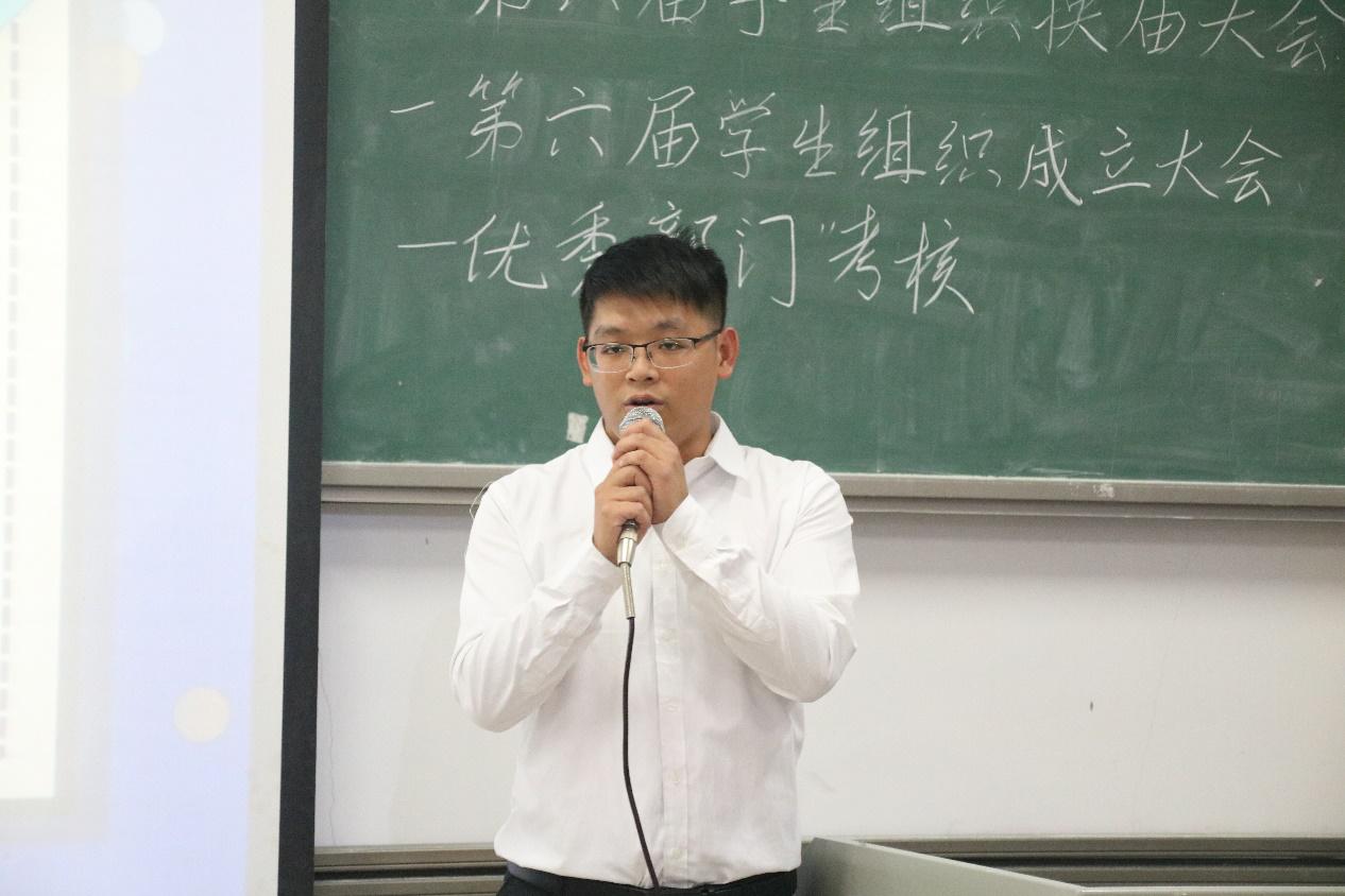 会议开始,司仪宣读新任书记团、主席团、秘书处秘书长团以及助班团名单,辅导员许鸿、李博为其颁发聘书,这份聘书,不仅代表着在这一年中工作的收获和成长,也承载着大家的认可。颁发完毕,团委第一副书记张秋爽作为学生组织负责人代表上台发言。张秋爽表示,在过去的时间里,学生组织的优秀榜样影响着并带领着她不断成长,促使她成为一个更加优秀的人,并希望在未来的工作中大家能够携手同行,追梦向前。其后,司仪宣读学生组织新任部长名单,学生组织负责人上台为其颁发聘书,部长代表陈玉佩上台发言。随后,司仪宣读第五届学生组织优秀干部、干事名单,并由辅导员许鸿、李博为其颁奖。紧接着,司仪宣读新任干事名单后,秘书处、团委以及新闻中心的部门代表上台发言进行部门考核,他们对所属部门的一年工作进行了汇报,并提出了部门未来的规划,发言其间汇报的工作成就以及播放的部门工作、团建视频精彩合集,赢得了观众的阵阵掌声。部门代表发言完毕,司仪宣读民主考核先进个人名单并为其颁发奖状。大会进行到此时,打分已统计完毕,司仪宣读优秀部门名单,颁发奖状。大会进入尾声,辅导员李博对大会进行了总结,他对大家提出了“四个得”。一是“干得过”,要怀一颗责任心,把工作做好,并在其中有所获;二是“稳得住”,要沉着冷静,具备应对以及处理突发事件的能力;三是“沉得下”,作为学生组织的一员,做事有序且沉稳;四是“不得忘”,辅导员李博提醒大家不忘初心、努力前行,希望大家可以在大学学得真本领,提升自身各方面的能力,为了祖国的伟大复兴贡献一份力量。