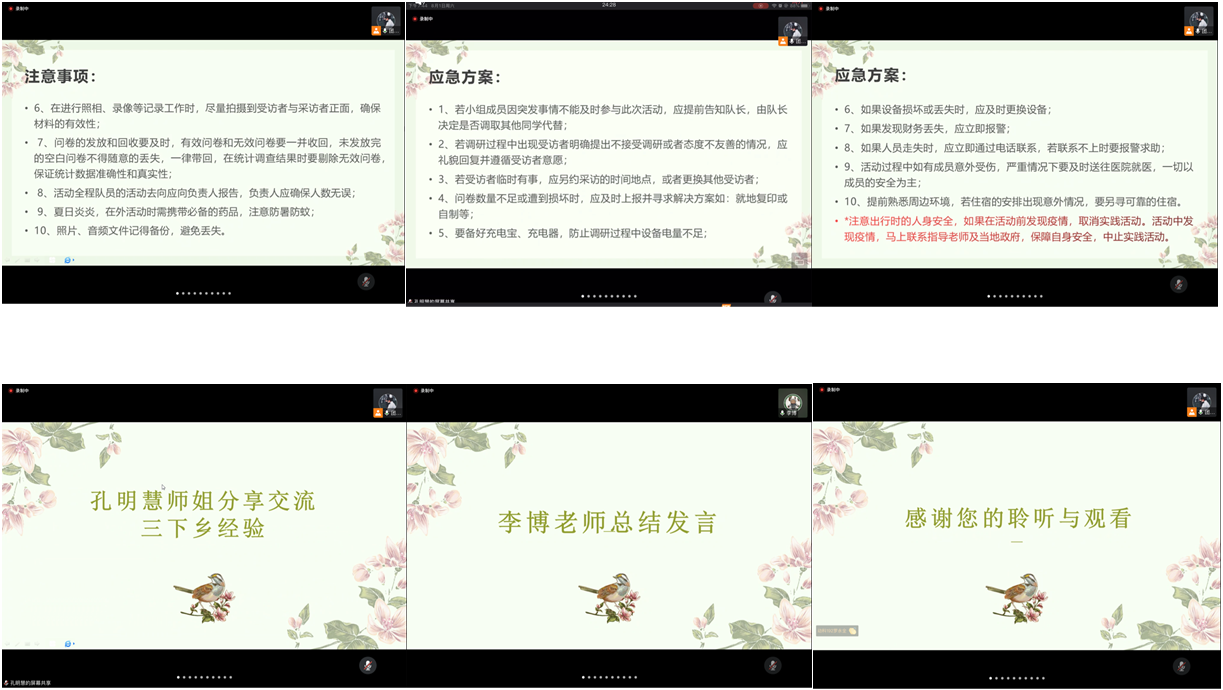 会上,张秋爽为同学们介绍了问卷的制作及其对应的方法。她讲道,调研主题不要过于广泛,要有针对性这一问题,并举了例子和给出一些解决方法。同时建议同学们要注意活动前后的疫情问题和在活动前要预测可能出现的突发情况。并且说明了遇到突发情况,要先紧急联系队长,若队长不能解决问题,则要第一时间通知指导老师。然后孔明慧为同学们分享三下乡的经验。她首先提出了调研部分可能出现的问题和解决方法,其次建议同学们可以通过与网上调研相结合的方式来丰富调研内容。接着提倡前期要做好充足的准备,如主题,调研的年龄段等的确定,以便后续的工作正常进行。最后提议调研过程中成员们要注意记录汇总,提高调研质量。随后,辅导员李博表明了三下乡过程中要注意国家安全,人身安全,交通安全,疾病的预防,社交礼仪,团队活动中的交流讨论等方面的事项。辅导员许鸿在会议的最后强调了安全的重要性,并祝福同学们可以有一个美好而特殊的回忆同时期待三下乡圆满完成。