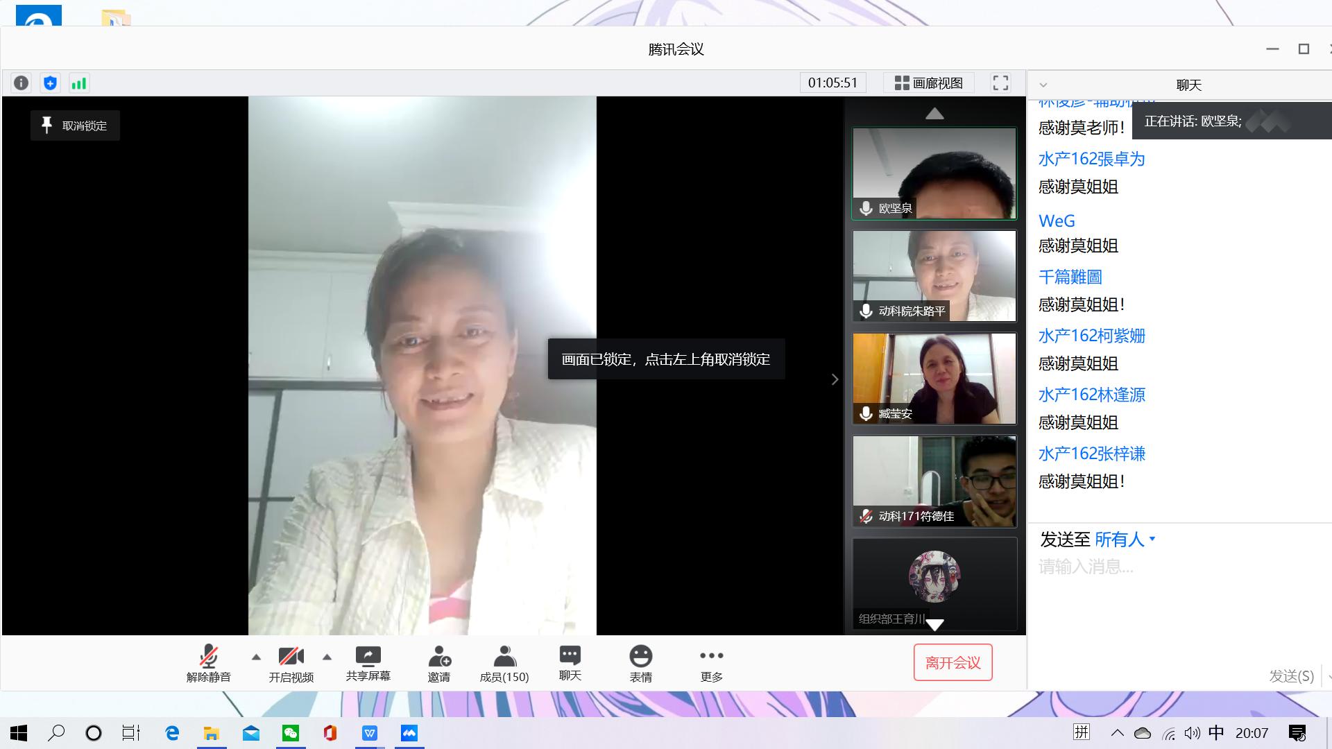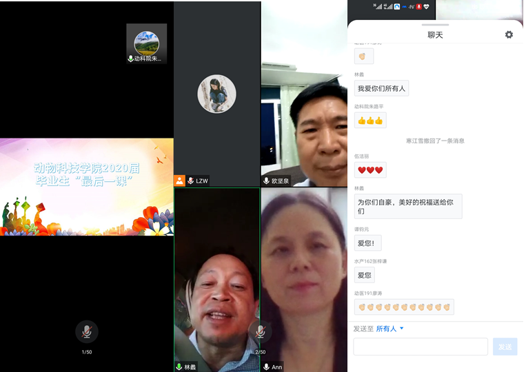 一段精心制作的视频掀开了活动的序幕,师生们一起回顾了大学四年来的点点滴滴。“最后一课”上,院长林蠡寄语毕业生们,生活因疫情搬上云端,云课堂、云就业、云面试、云签约孕育而生,希望同学们能够坚定信心,持拥抱时代变化的态度和勇气,踏着新时代的步伐走向未来。两位毕业班班主任深情回顾了与同学们相处的点滴故事,向同学们表达了最美好的祝福。毕业生代表区海欣向全体师生表示衷心的祝愿,表达对大学时光的留恋和对老师们悉心培养的感激之情,表态会继续努力,填好人生的履历为母校争辉添彩。在校生代表动科172班骆思园祝愿师兄师姐在今后的岗位上谱写人生辉煌的篇章,扬帆起航,一路欢歌。
