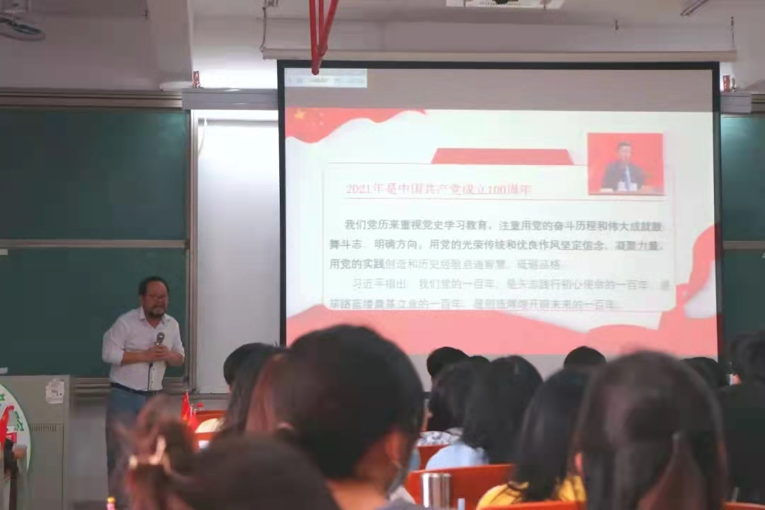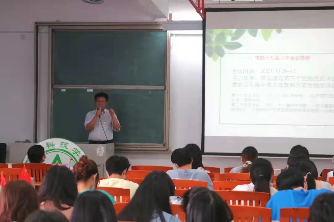 课堂上,欧坚泉书记以《做习近平新时代中国特色社会主义思想的坚定信仰者和忠实实践者》为题,梳理和解读了十九届六中全会精神,他从习近平新时代中国特色社会主义思想及共产党发展的四个阶段,诠释了党百年奋斗的初心使命、重大成就和奋斗经验。他强调,要把党史学习的成果转化为改造主观世界和客观世界的实际行动,从思想上、理论上、情感上、实践上认同习近平新时代中国特色社会主义思想。一是做习近平新时代中国特色社会主义思想的坚定信仰者和忠实实践者。二是立德修身,做德智体美劳全面发展的优秀大学生。三是学好专业,投身乡村振兴,为中华民族的伟大复兴做出应有的贡献。四是党员同志要带头遵守校园疫情防控的要求,做好疫情防控,守住校园疫情防控底线。