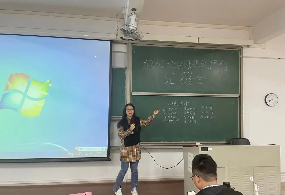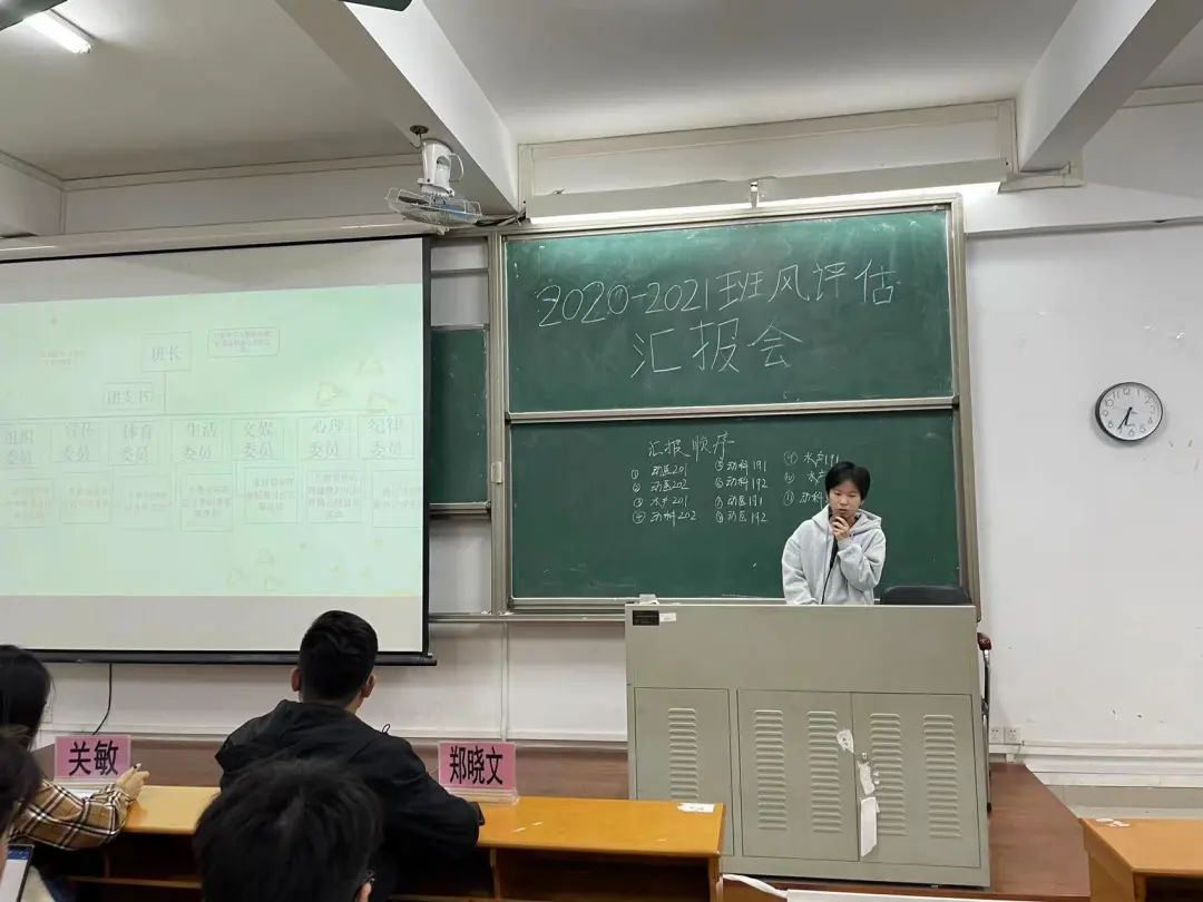 汇报环节中,各班班长依次汇报本班班级建设、学风建设、思想建设及文体建设情况。各班情况总体优秀,班干部认真负责,尽心为班级服务;学风建设良好,学习氛围浓厚;积极参与校内外文体活动。但部分班级也存在着成绩两极分化、文娱活动参与度低等问题。