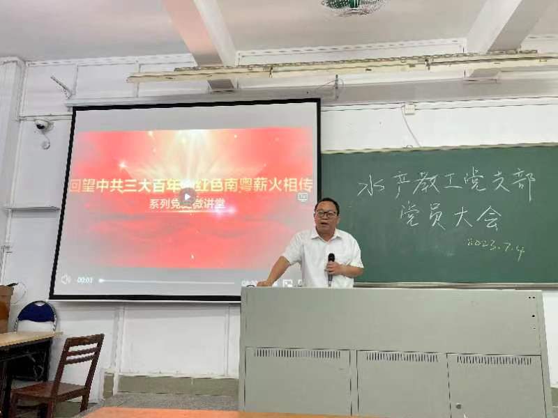 为深入推进学习贯彻习近平新时代中国特色社会主义思想主题教育走深走实,进一步推动学院各项工作高质量发展,7月4日,学院院长林蠡在海珠校区教学楼203为水产养殖教工党支部党员讲授党课,党课由学院党委副书记李昌辉主持。