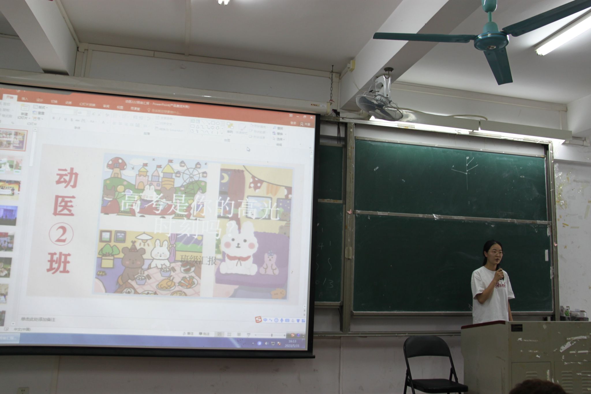 动医222班孙湘以《高考是你的高光时刻吗》为主题,从社会实践情况、班级情况、学习情况和未来规划四个方面对班级一年来同学们的学习生活情况进行了汇报。她表示高考或许是大家学习状态最好的时候,但绝不是最高光的时刻,不一样的选择可能有不一样的精彩。暂时看不到成果不代表没有成长,每个人要为长成参天大树而努力扎根、生长。