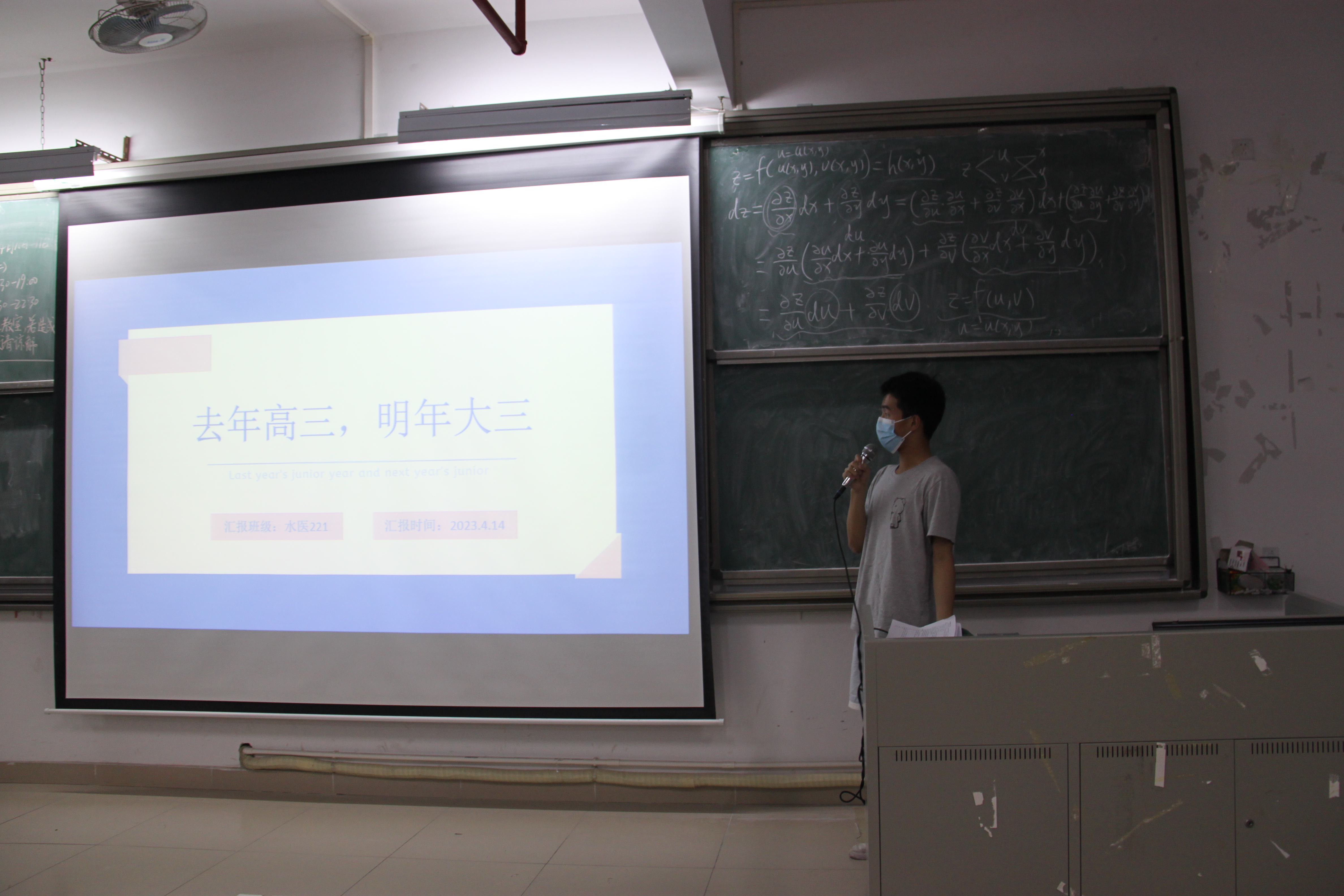 首先,水医221班许豪洪以“去年高三、明年大三的”为主题对一年的大学生活进行总结汇报,并从社会实践活动、学习情况、班级建设方向和未来发展方向四个方向展开,表示现在学习时间紧迫,同学们要尽早做好未来规划,鼓励同学们在往后学习中有方向性地发展,成功达到目标。