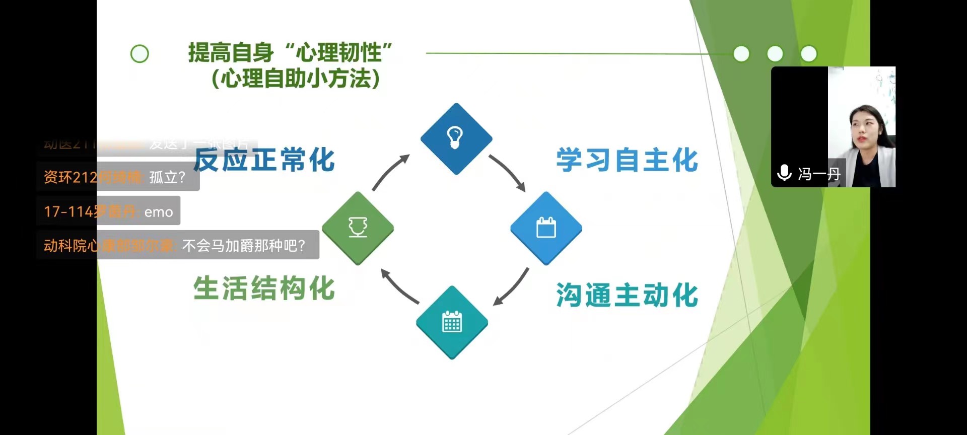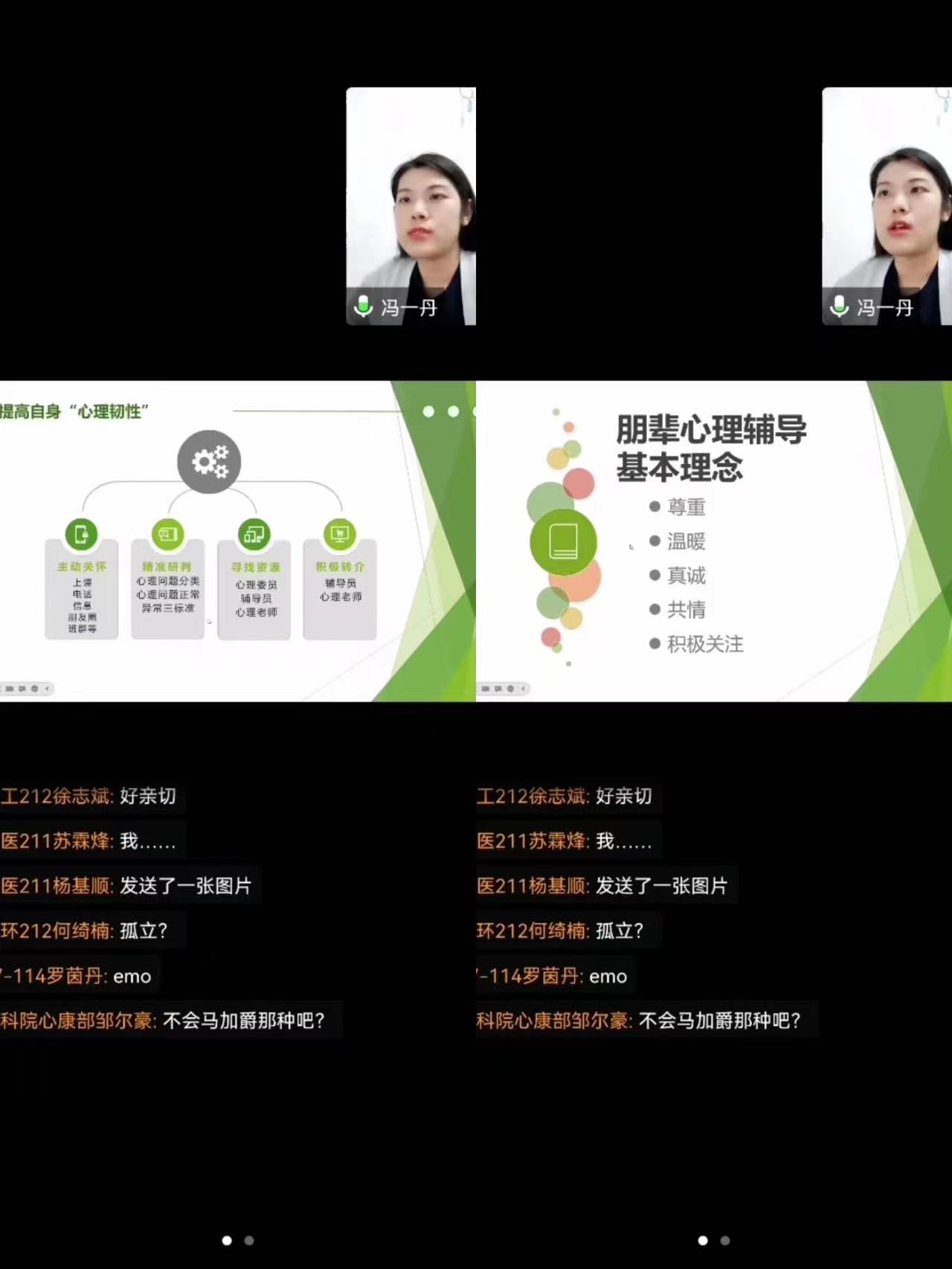 本次会议围绕新形势下大学生的心理特征、疫情反复下大学生的心理特征、宿舍心康员如何发现问题和宿舍心康员的“助人与自助”四个方面展开。首先,冯一丹指出,宿舍心康员同时具有心理知心人、宿舍守护者和危机汇报员这三个角色的特点,并分享了做好这三个角色的具体方法。接着,她向宿舍心康员们普及了大多数在校大学生心理问题的来源,以及在疫情反复中大学生可能遇到的困难和心理失衡的表现,并从精神、认知、情绪三方面给宿舍心康员们支招,教导大家及时发现并反映舍友的异常行为。然后,在KY开元集团官网四位同学的配合下,冯一丹利用“一人一故事剧场应用戏剧”的方式,让大家感受到日常冲突是怎么发生的,引出朋辈心理辅导基本理念:尊重、温暖、真诚、共情、积极关注。最后,冯一丹分享了四个心理自助小方法:反应正常化、生活结构化、沟通主动化和学习自主化,强调帮助他人前先学会自助,宿舍心康员们要提高自身“心理韧性”,坚持主动关怀、精准研制、寻找资源、积极转介。