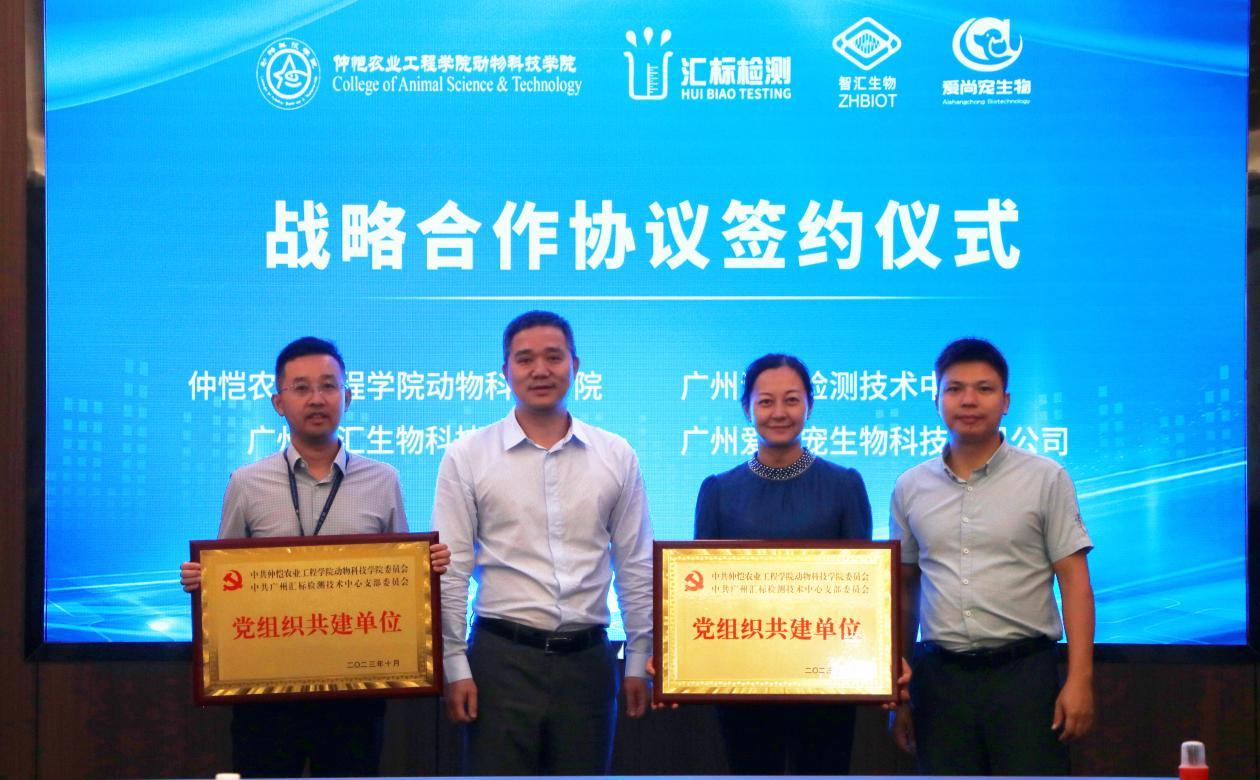 朱路平代表KY开元集团官网与广州汇标检测技术中心、广州智汇生物科技有限公司、广州爱尚宠生物科技有限公司共同签署了战略合作协议,并与广州汇标检测技术中心党支部书记李丰互授“党组织共建单位”牌匾。