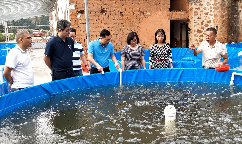 在杨明沾、黄振声等陪同下,科技特派员团队对该镇主要产业进行了考察,就加州鲈养殖病害防治、工厂化养殖水循环、销售途径等问题进行技术指导,切实帮助养殖农户解决生产过程中的难题,并为养殖户提供工厂化养殖最新设备的参考。